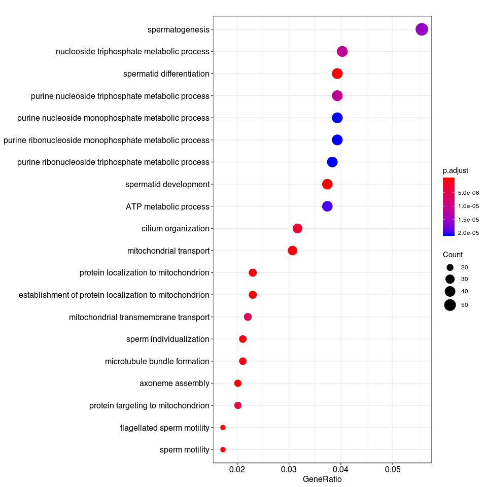 To get a better understanding of the underlying biological processes driving the differences among clusters I looked at gene ontology. SP and EPS have genes associated with transcription and translation. EPS was also significant for chromatin organization. PS1, PS2, and P3 show genes associated with sperm development. With genes up regulated in PS3 almost entirely associated with sperm production. The cyst cell lineage (ECY, CY1, and CY2) show evidence of genes associated with translation. The TE and PC clusters show genes associated with morphogenesis and growth.